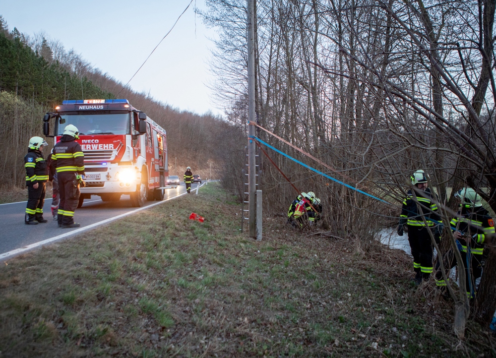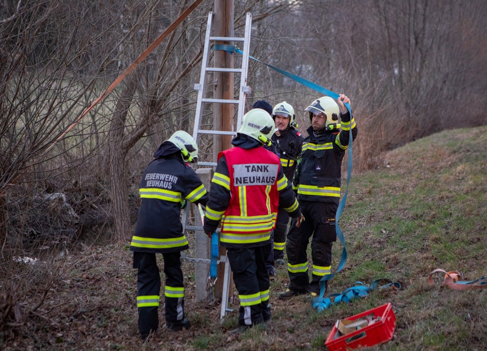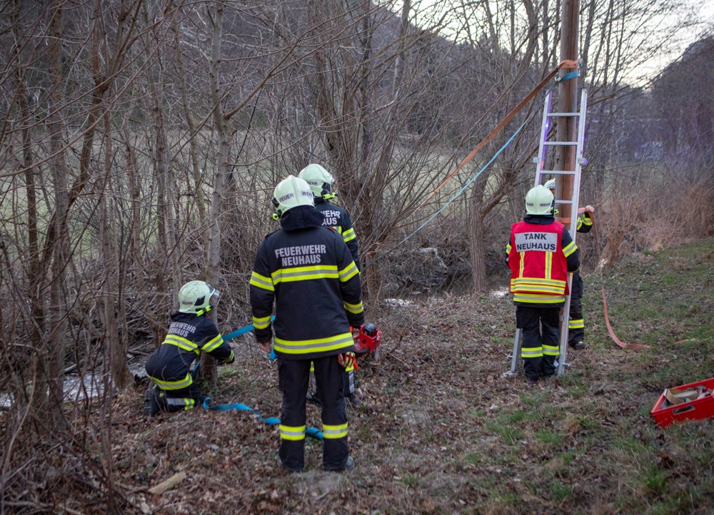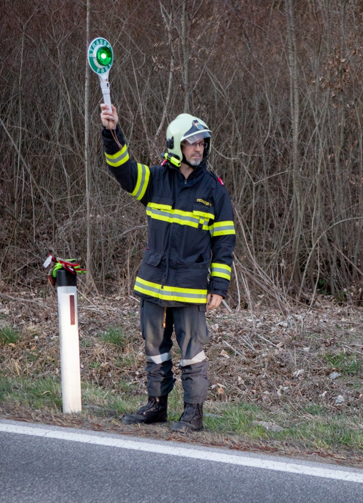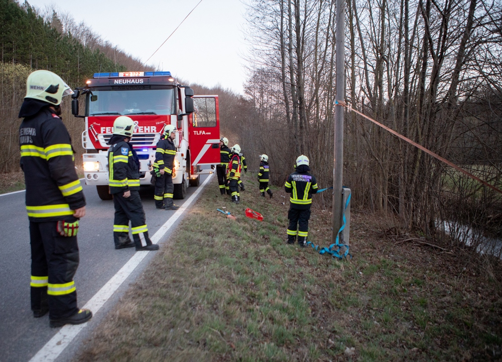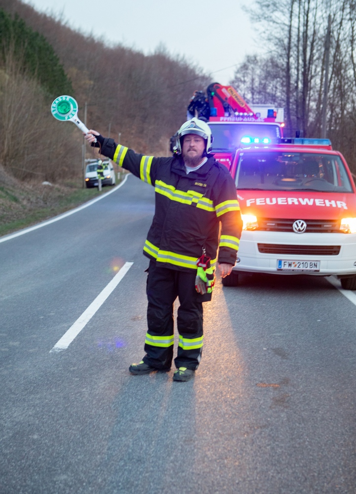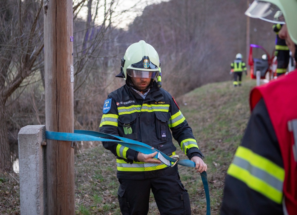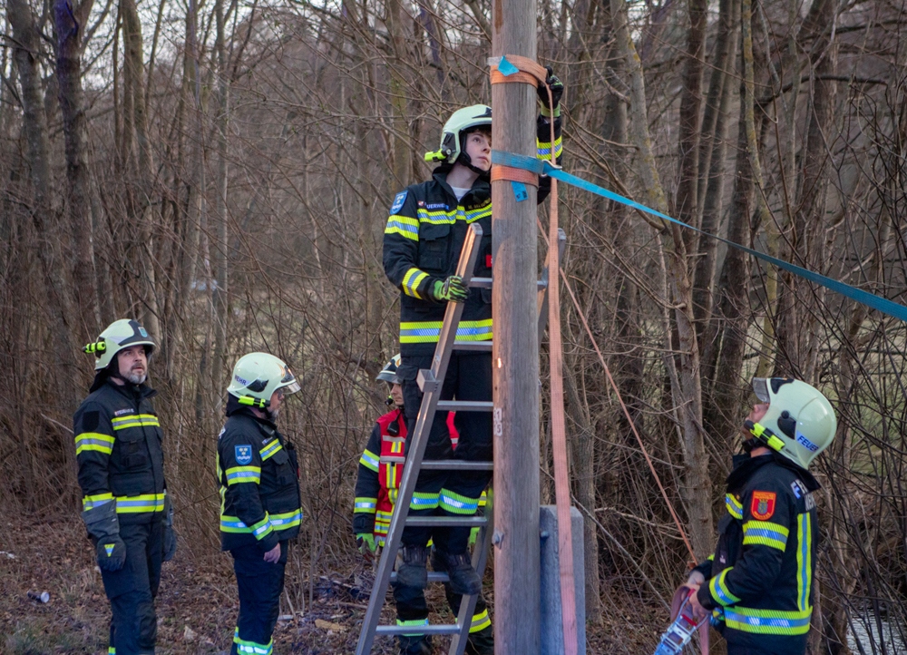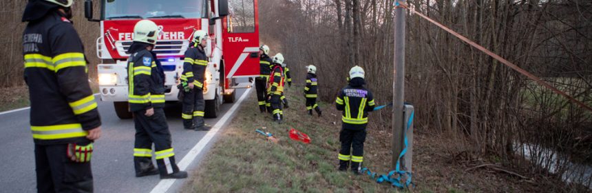 Als wir wenig später die Einsatzstelle erreichten, war die Polizei bereits vor Ort und ein Mast der Telekom wurde bereits von einem vorbeikommenden Kameraden der FF Altenmarkt mit einem Zurrgurt gesichert.