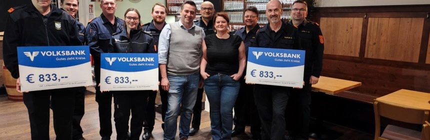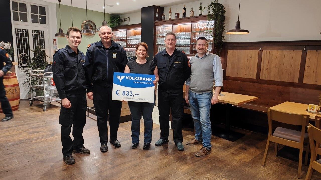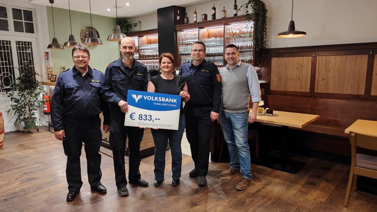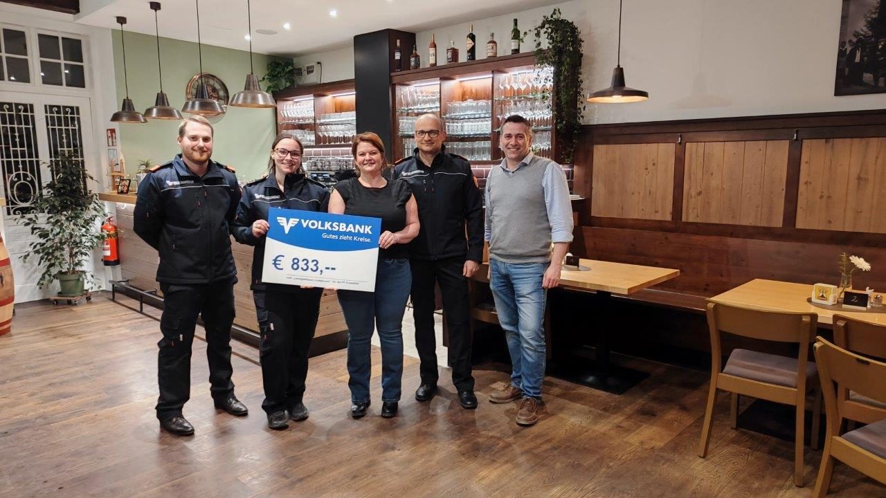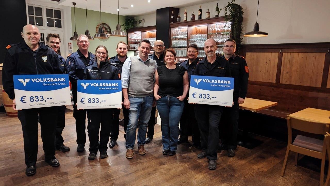 Bei der Eröffnung des Landgasthaus Lindabrunn Anfang März gingen, die Getränke und Speisen auf die neue Wirtin Lisi Benedetter. Zusätzlich stellte sie ein Glas für freiwillige Spenden zugunsten der Feuerwehren Enzesfeld, Lindabrunn und St. Veit auf. Am 17. März 2026 überreichte sie die Spendenchecks in Höhe von insgesamt rund 2.500,- Euro / jeweils 833,– Euro an die drei Feuerwehren.